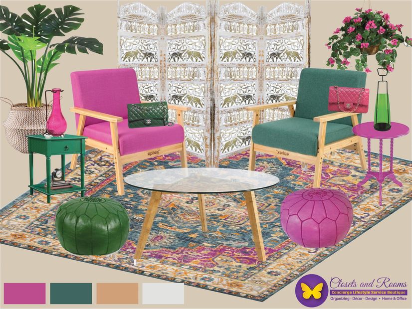 Earth tones are matched with the unexpected and vibrant fuchsia for a modern spin of a traditional room. Moroccan decor harmoniously live together with contemporary glass and wood furniture adding warmth and settling the room. Since in Interior Design Bigger is Better, we have added a foldable screen (carved paneling hung on the walls also have the effect) as rooms dividers or wall accent behind or next to the furniture. The result is a happy modern cozy room.